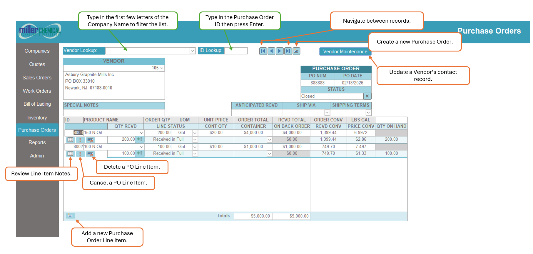 To quickly navigate to a specific Purchase Order, type the number of the Purchase Order in the ID Lookup field then hit Enter to navigate to that record.